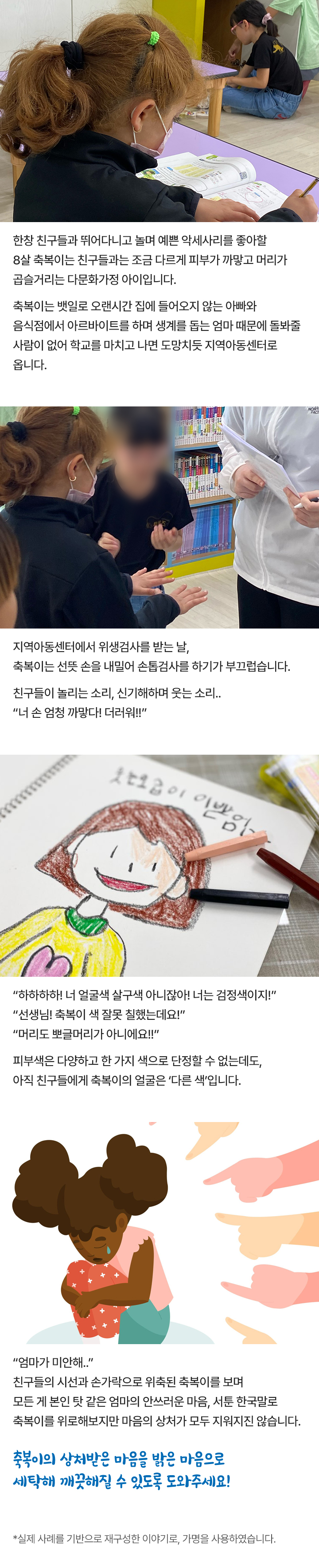소중한 우리아이들의 마음이 어두워지지않도록, 여러분의 사랑으로 축복이의 상처받은 마음을 밝게 세탁해 주세요
